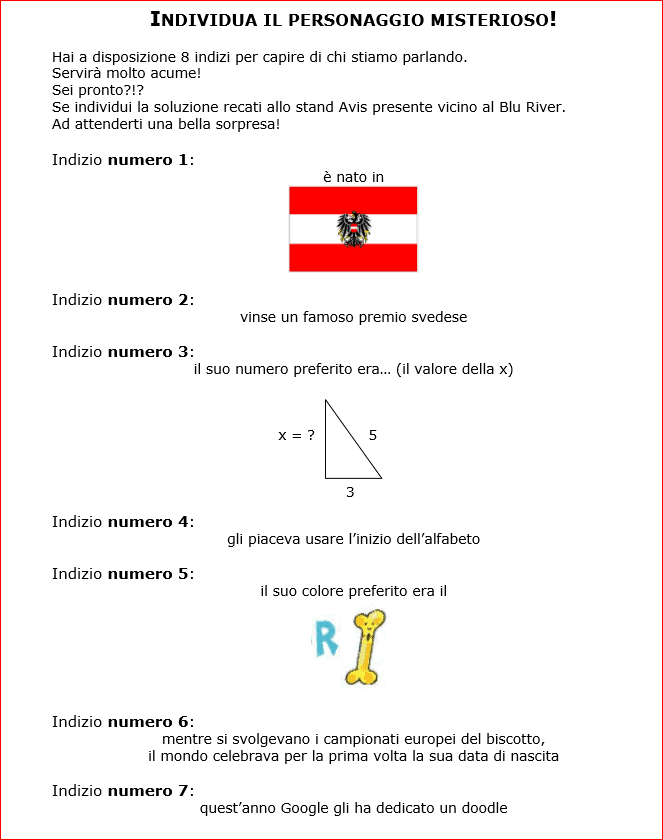 #MIRABILAVIS gioco 1: individua il personaggio misterioso! Ingrandisci immagine Gioca con noi a #mirabilavis! Hai a disposizione 8 indizi per capire chi è il personaggio misterioso…Servirà molto acume! Sei pronto?!? Se individui la soluzione vai allo stand Avis vicino al Blu River. Ad attenderti ci sarà una bella sorpresa! Di AVIS Emilia-Romagna|2025-03-06T14:53:42+01:0013 Luglio 2016|0 CommentiCondividi suFacebookBlueskyLinkedInMastodonWhatsAppTelegramCopy Link Post correlati Ferro e ferritina: qual è la differenza? Galleria Ferro e ferritina: qual è la differenza? Genere, sesso e alimentazione Galleria Genere, sesso e alimentazione Donazione di sangue e permessi retribuiti Galleria Donazione di sangue e permessi retribuiti Scrivi un commento Annulla rispostaCommento Salva il mio nome, email e sito web in questo browser per la prossima volta che commento. Acconsento all’archiviazione dei miei dati secondo l’Informativa sulla Privacy