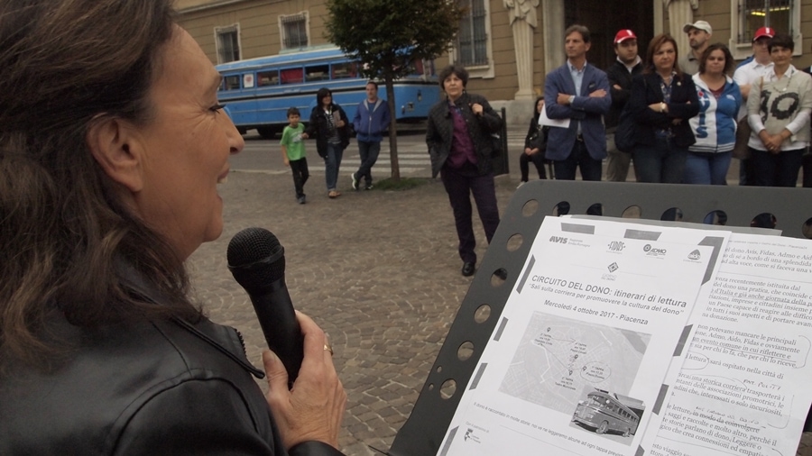 Il 4 ottobre Piacenza ha ospitato CIRCUITO DEL DONO: itinerari di lettura, un’iniziativa promossa dalle Associazioni regionali Avis, Fidas, Aido e Admo proprio in occasione del giorno del dono. Come si intuisce dal nome, l’evento si è svolto per le strade della Provincia emiliana seguendo un percorso di 4 tappe, partendo da Piazza Duomo fino ad arrivare a Piazza Cavalli. Ad ogni sosta del tour, effettuato a bordo di una corriera storica, sono state proposte letture sul tema del dono e sulla cultura della donazione. Un altro modo questo, attraverso l’espediente narrativo, per condividere e promuovere il senso di solidarietà e l’importanza di donarsi agli altri.