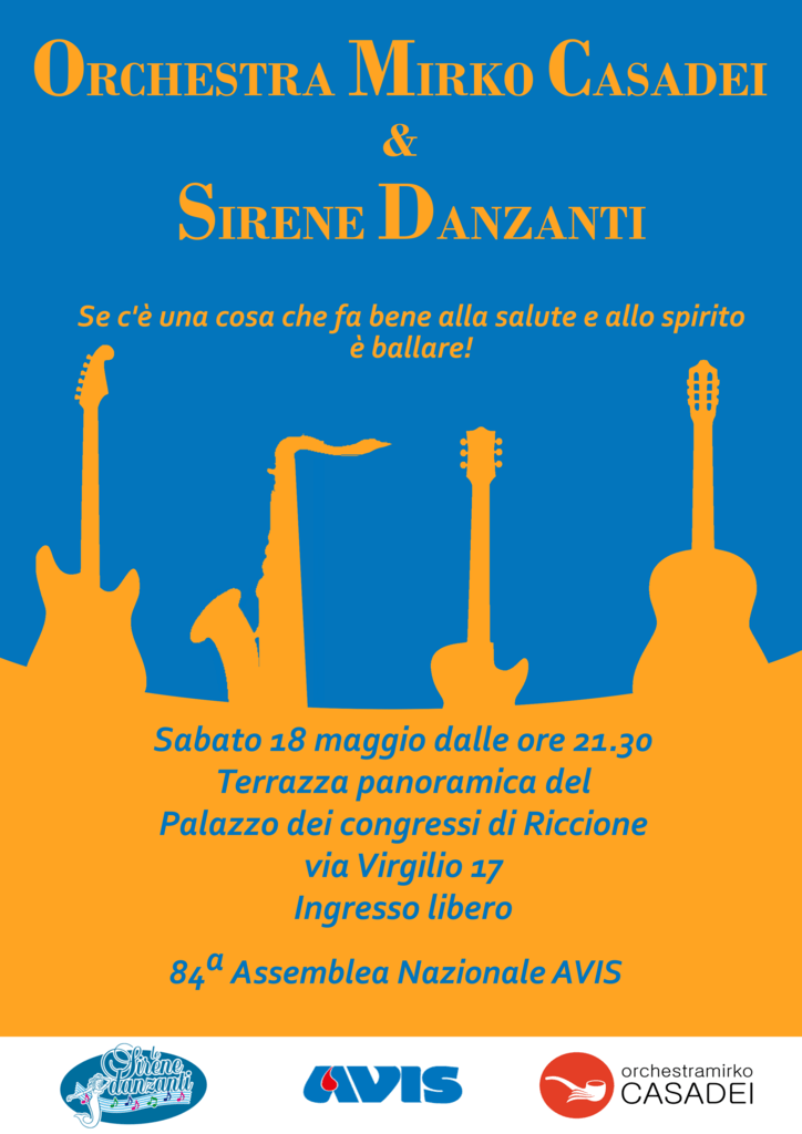 Per la serata di sabato, sulla terrazza panoramica del Centro Congressi, Avis Emilia-Romagna organizza una serata di danze, aperta a tutti, con l’Orchestra Mirko Casadei.