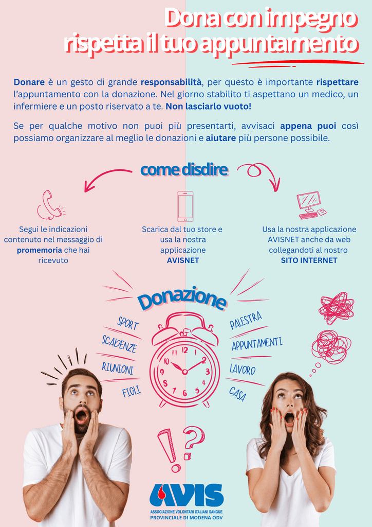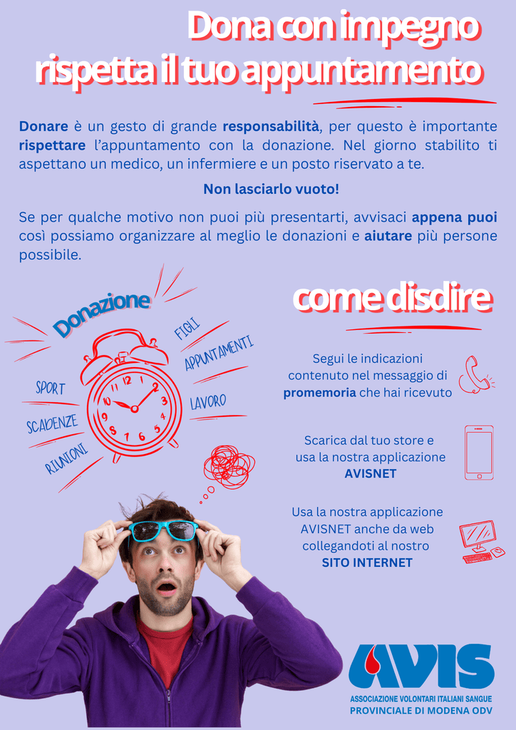 […] In alcune sedi Avis della Regione Emilia-Romagna c’è la tendenza a non presentarsi all’appuntamento col dono senza disdire. Un fenomeno che a volte riguarda 1 donatore su 4. Può essere un problema: per sapere il perché leggi l’articolo presente sul sito di Avis Regionale Emilia-Romagna, che trovi a questo link. […]
